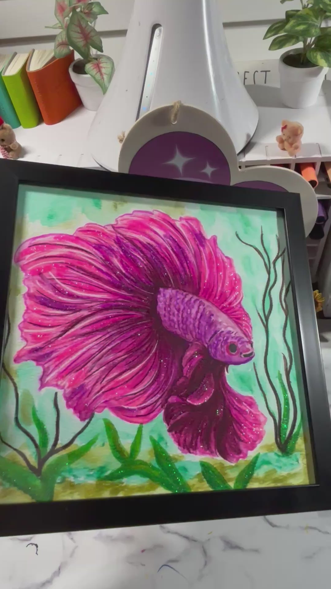 Beautiful and colorful hand painted watercolor media with a touch of glitter. Size 8x8. Already comes with a black picture frame so itโs ready to hang and decorate your wall :)ย