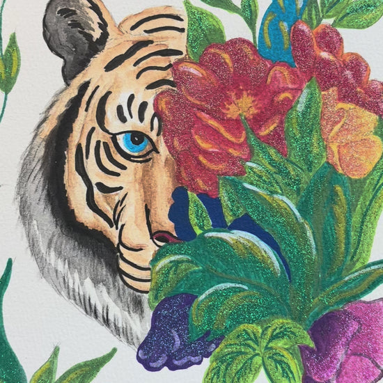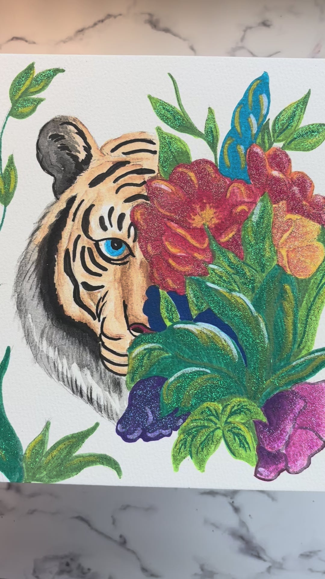 This special tiger reflects his/her softer side with a flower bouquet :) Painted with acrylic markers, watercolor markers and glitter.
